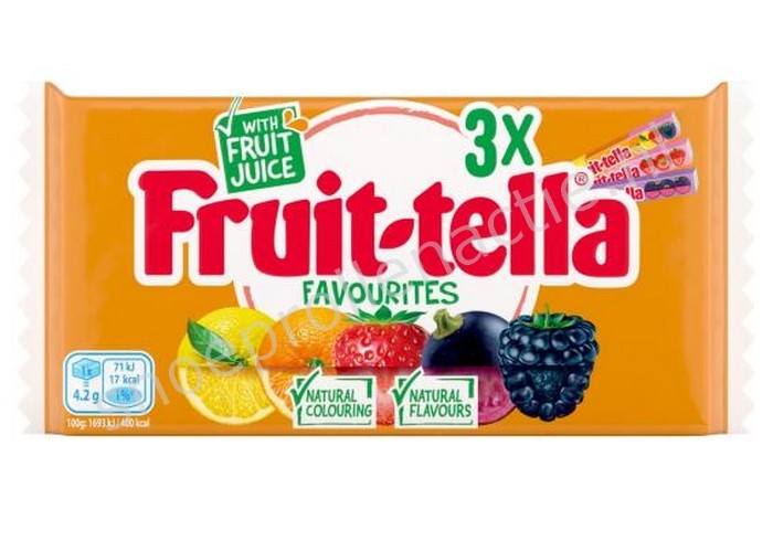 Fruit-tella Favorite (4 mix rollen) een rol Summerfruit (aardbei, citroen, braam en sinaasappel), een rol strawberry (aardbei), en een rol Blackcurrant ( zwarte bessen)